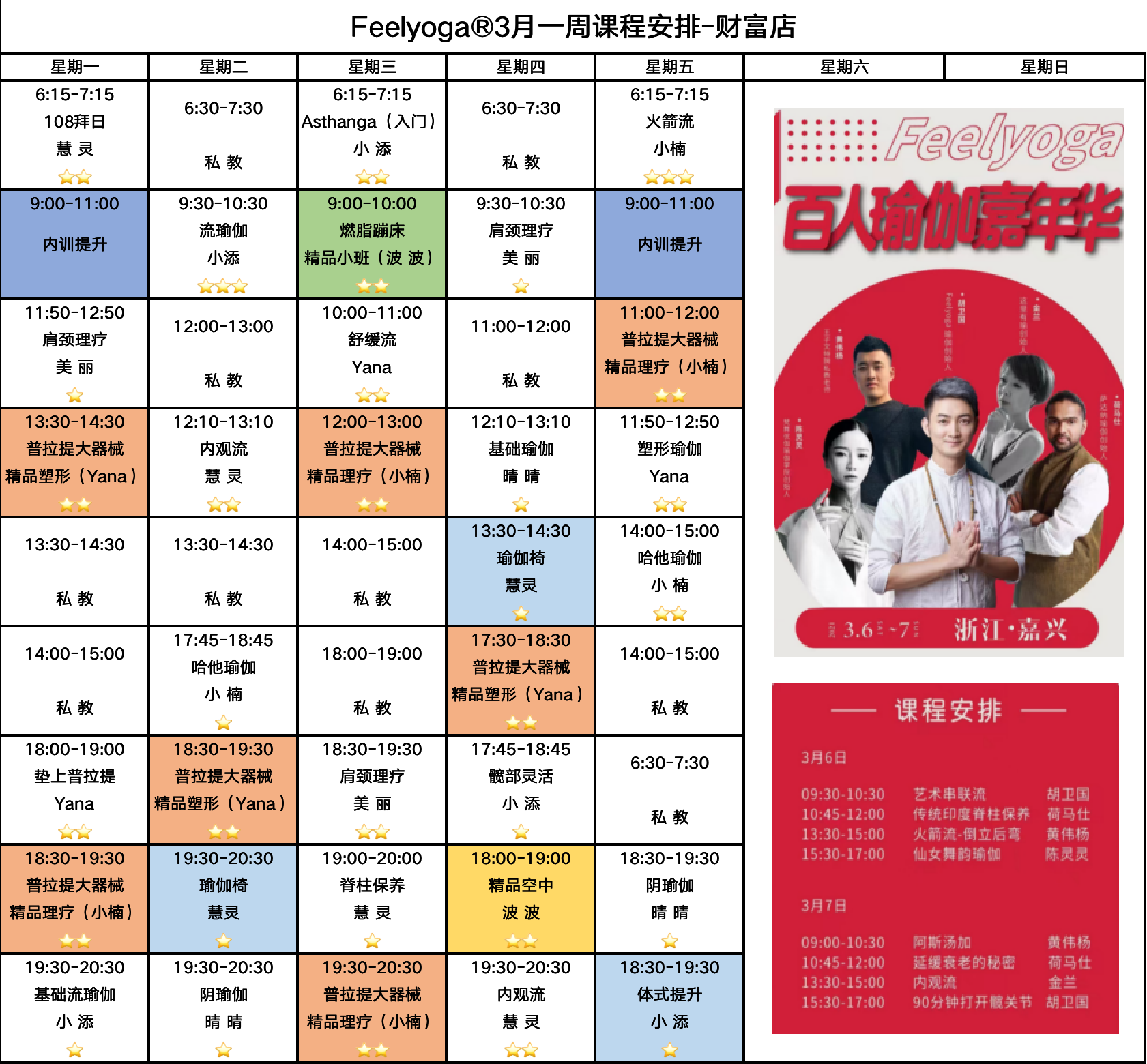 下面是我们feelyoga三大直营门店(智慧湾店、巨峰路店、嘉兴财富广场店)三月份的课程安排,让我们在三月开始一个美满的瑜伽旅途!